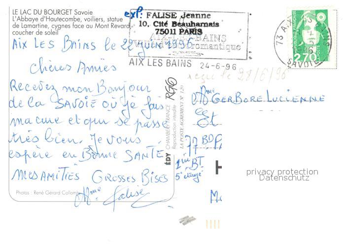 13227654 carte postale Aix-les-Bains Lac du Bourget Abbaye d Hautecombe voiliers Statue de Lamartine cygnes Mont Revard Coucher de soleil postalisch gelaufen Erhaltung siehe scans [FriedD77] KatCode: 11170073273008