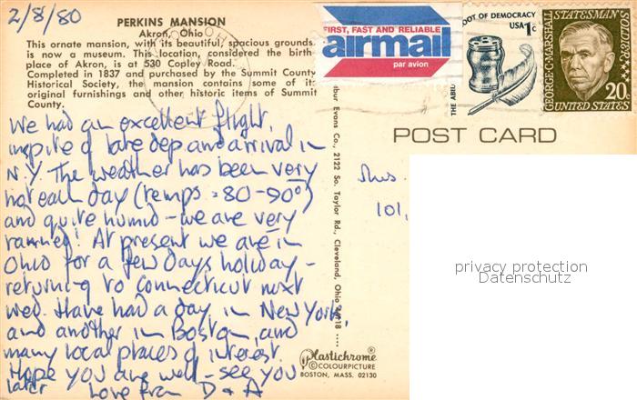 73131658 old postcard Akron Ohio Perkins Mansion postalisch gelaufen Erhaltung siehe scans [KathaD81] KatCode: 14140370000000