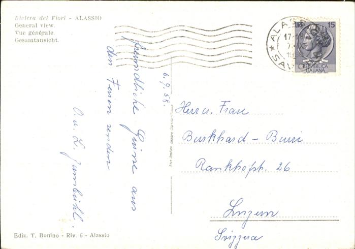 old postcard ALAssIO Savona Liguria IT postalisch gelaufen
