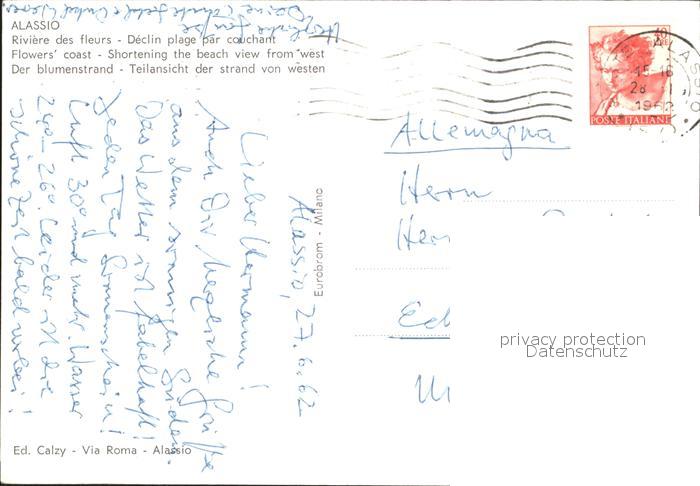old postcard ALAssIO Savona Liguria IT Blumenstrand postalisch gelaufen Erhaltung siehe scans