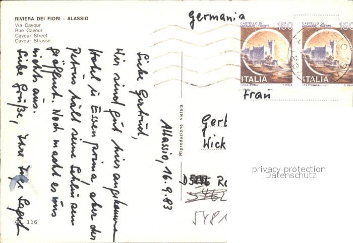 old postcard ALAssIO Savona Liguria IT Cavour Strasse postalisch gelaufen Erhaltung siehe scans