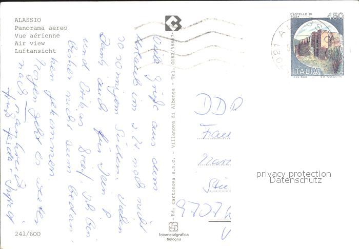 old postcard ALAssIO Savona Liguria IT Fliegeraufnahme postalisch gelaufen Erhaltung siehe scans