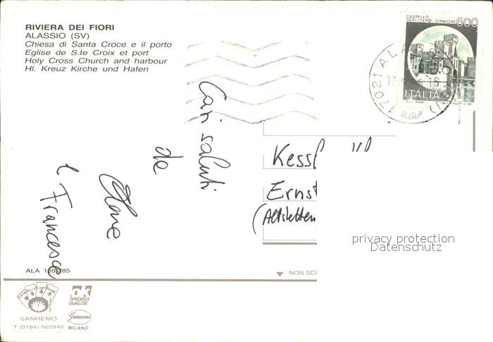 old postcard ALAssIO Savona Liguria IT Heiligkreuz Kirche Hafen postalisch gelaufen Erhaltung siehe scans