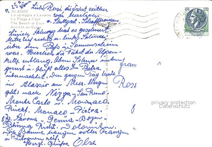 old postcard ALAssIO Savona Liguria IT La spiaggia a Levante postalisch gelaufen Erhaltung siehe scans