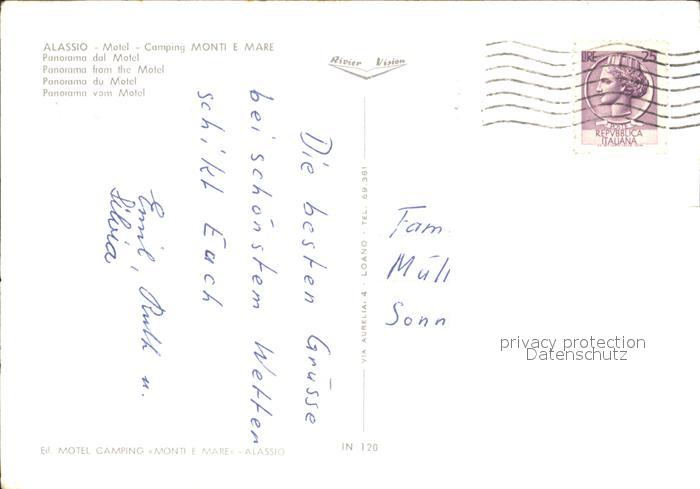 old postcard ALAssIO Savona Liguria IT Motel Camping Monti e Mare postalisch gelaufen Erhaltung siehe scans