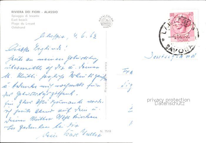 old postcard ALAssIO Savona Liguria IT Oststrand postalisch gelaufen Erhaltung siehe scans