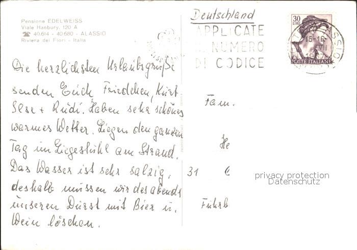 old postcard ALAssIO Savona Liguria IT Pension Edelweiss postalisch gelaufen Erhaltung siehe scans