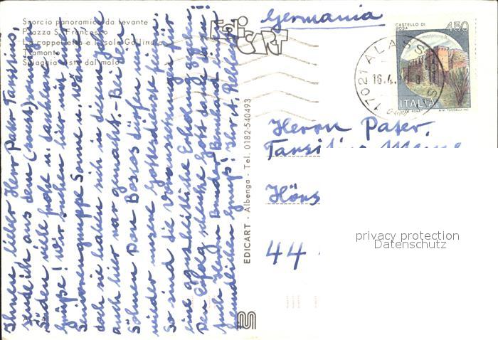 old postcard ALAssIO Savona Liguria IT Piazza San Francesco Cappelletta Isola Gallinara Tramonto Spiaggia postalisch gelaufen Erhaltung siehe scans