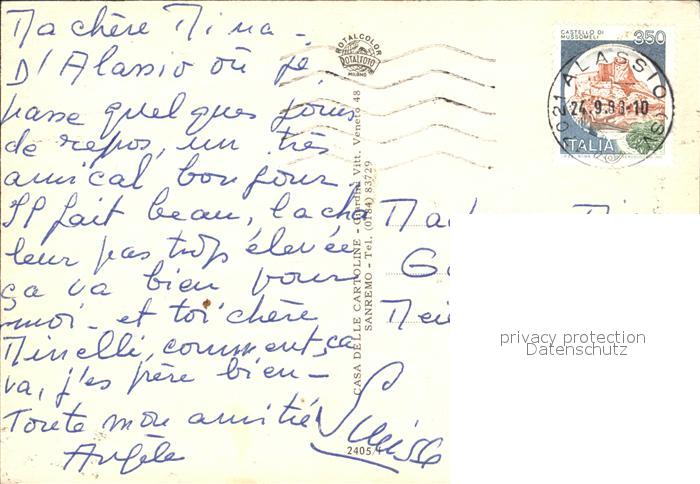 old postcard ALAssIO Savona Liguria IT Riviera dei Fiori Panorama Sonnenuntergang postalisch gelaufen Erhaltung siehe scans