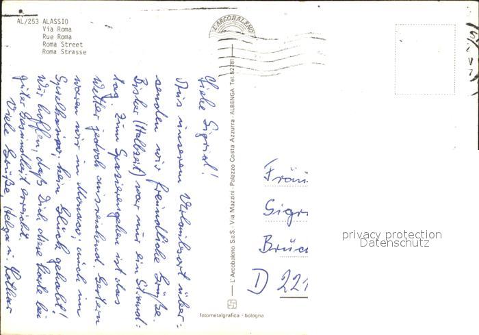 old postcard ALAssIO Savona Liguria IT Roma Strasse postalisch gelaufen Erhaltung siehe scans