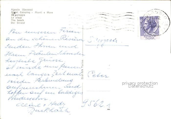 old postcard ALAssIO Savona Liguria IT Spiaggia Strand Aussicht von Terrasse postalisch gelaufen Erhaltung siehe scans