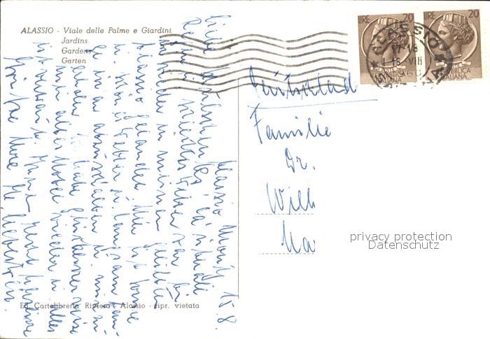 old postcard ALAssIO Savona Liguria IT Viale delle Palme e Giardini postalisch gelaufen Erhaltung siehe scans