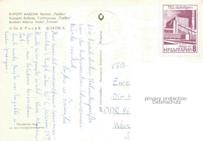 74156904 old postcard Albena BG Hotel-Terwel Strand Sonnenschirme Schwarzes-Meer Sozialistischer-Bau Badegaeste Busse postalisch gelaufen Erhaltung siehe scans [Karloger] KatCode: 11090