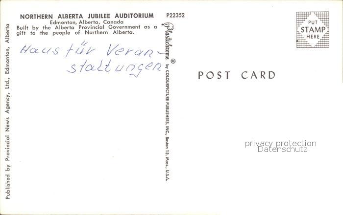 Alberta Edmonton Northern Alberta Jubilee Autitorium postalisch nicht gelaufen Erhaltung siehe scans