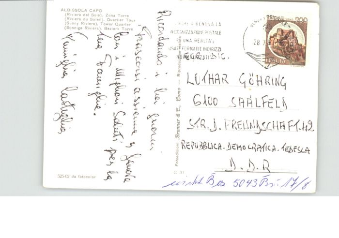 old postcard Albissola Capo Riviera Sole Zona Torre postalisch gelaufen