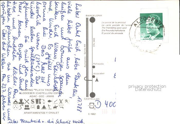 old postcard Alcoceber Alcossebre Camping Playa Tropicana postalisch gelaufen Erhaltung siehe scans