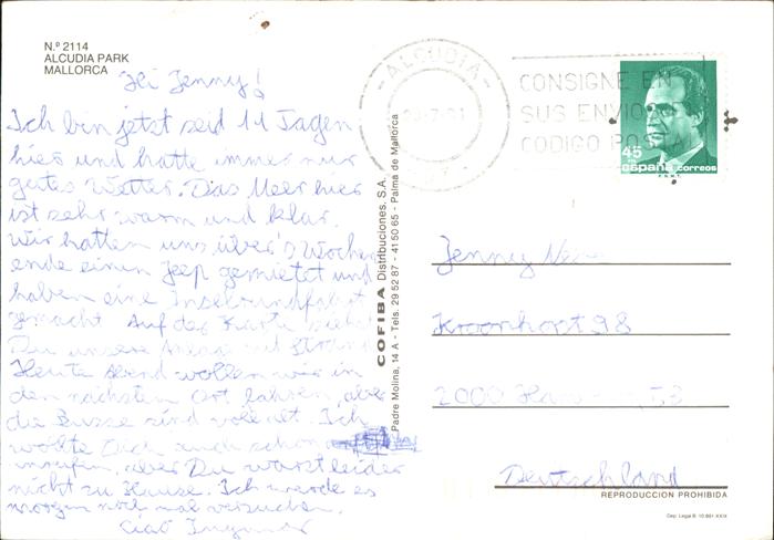 old postcard Alcudia Mallorca Alcudia Park Hotel Playa vista aerea postalisch gelaufen Erhaltung siehe scans