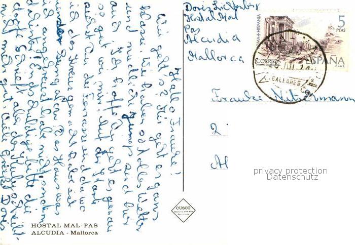old postcard Alcudia Mallorca Hostal Mal Pas postalisch gelaufen Erhaltung siehe scans [LiesaD40]