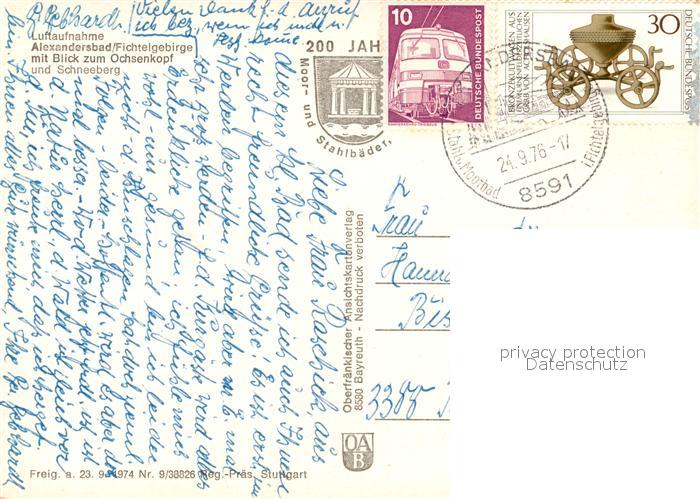 73120211 alte Postkarte Alexandersbad Bad Fliegeraufnahme Ochsenkopf Schneeberg postalisch gelaufen Erhaltung siehe scans [KathaD81] KatCode: 11110009479111