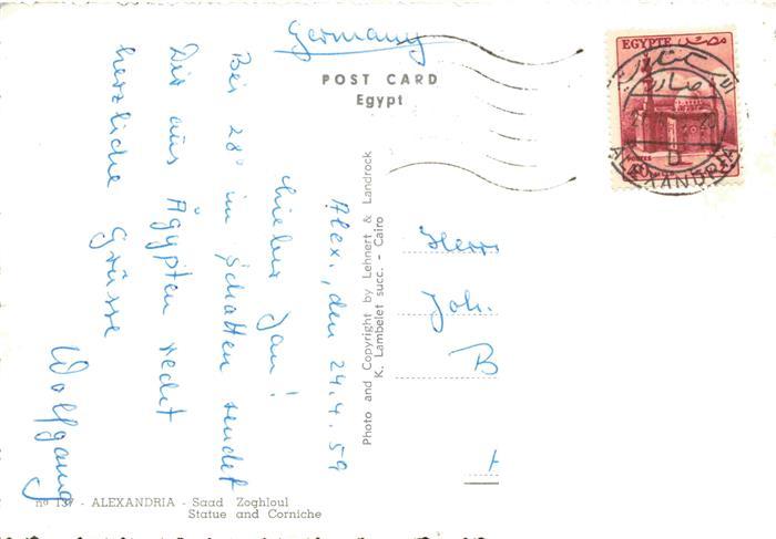 74014803 old postcard ALEXANDRIA Alexandrie Egypt Saad Zoghloul Statue and Corniche postalisch gelaufen Erhaltung siehe scans [WerneD78] KatCode: 18020
