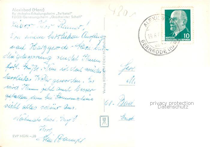 73863923 alte Postkarte Alexisbad Harz Reichsbahn Erholungsheim Selketal FDGB Genesungsheim Geschwister Scholl Fliegeraufnahme postalisch gelaufen Erhaltung siehe scans [WerneD78] KatCode: 11110015085145