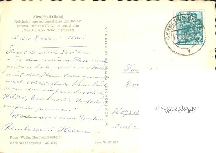 72427733 alte Postkarte Alexisbad Harz Reichsbahnerholunsheim-Selketal Genesungsheim-Geschwister-Scholl postalisch gelaufen Erhaltung siehe scans KatCode: 11110015085145