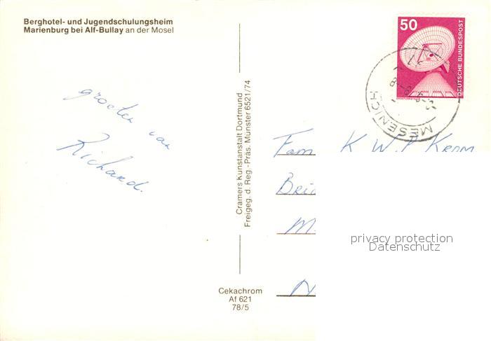 73308198 alte Postkarte Alf Bullay Mosel Fliegeraufnahme Berghotel und Jugendschulungsheim Marienburg postalisch gelaufen Erhaltung siehe scans [LiesaD40] KatCode: 11110007135001