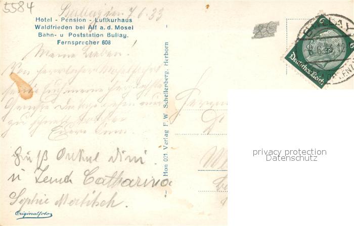 73695761 alte Postkarte Alf Bullay Mosel Moseltal Hotel-Pension-Luftkurhaus Waldfrieden postalisch gelaufen Erhaltung siehe scans [LiesaD40] KatCode: 11110007135001