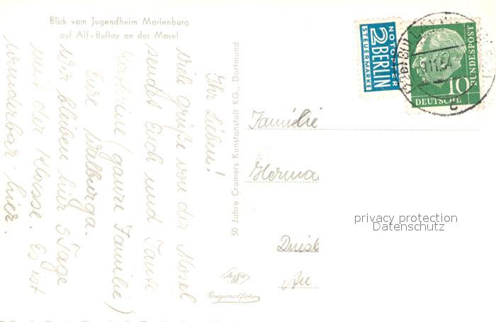 72992353 alte Postkarte Alf Mosel Blick vom Jugendheim Marienburg postalisch gelaufen Erhaltung siehe scans [AndreD76] KatCode: 11110007135001