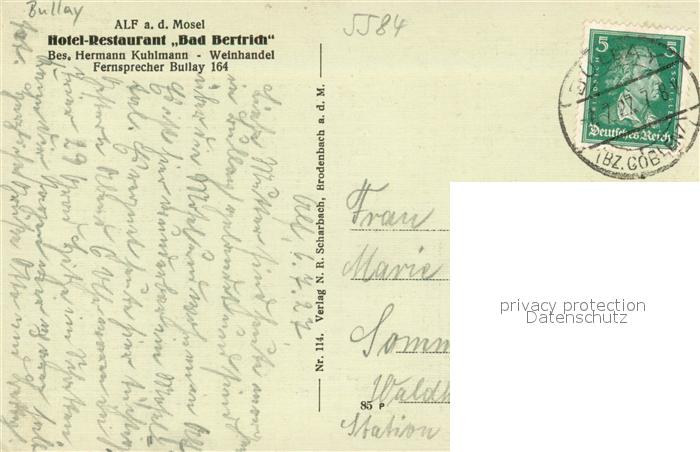 73546423 alte Postkarte Alf Mosel Pension Waldfrieden Bullay postalisch gelaufen Erhaltung siehe scans [KathaD81] KatCode: 11110007135001