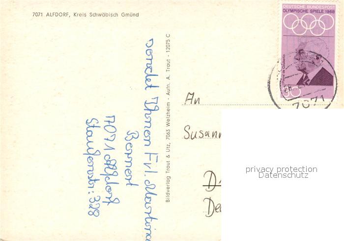 73125429 alte Postkarte Alfdorf Rathaus Brunnen Kirche Schule postalisch gelaufen Erhaltung siehe scans [FriedD77] KatCode: 11110008119001