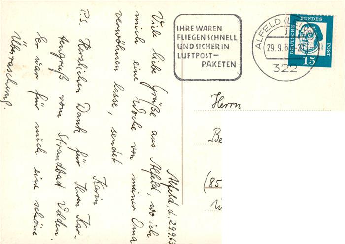 73884729 alte Postkarte Alfeld Leine Leinstr Gymnasium Postamt Heimatmuseum Leinebruecke Fillerturm Landratsamt Kaufm Berufsschule Freibad postalisch gelaufen Erhaltung siehe scans [FriedD77] KatCode: 11110003254002