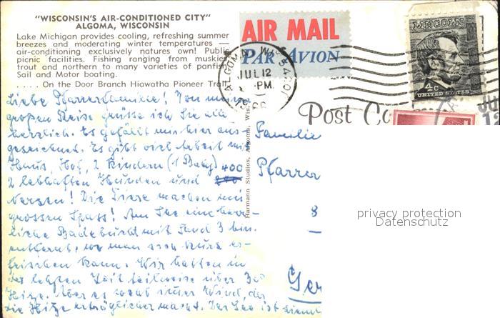 72444370 old postcard Algoma Wisconsin — postalisch gelaufen Erhaltung siehe scans KatCode: 14140520000000