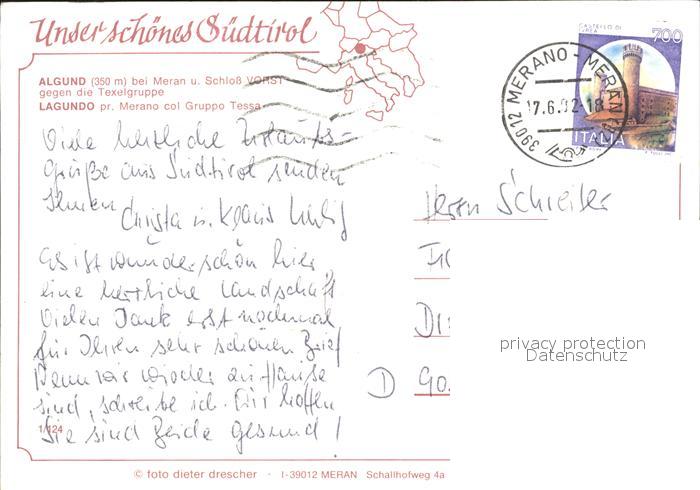 old postcard Algund Merano Schloss Vorst Texelgruppe postalisch gelaufen Erhaltung siehe scans