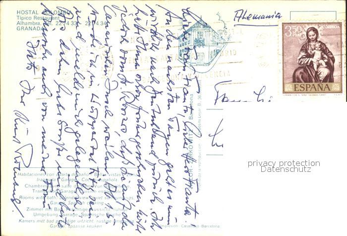 old postcard Alhambra Granada Hostal Colombia Tipico Restaurant postalisch gelaufen