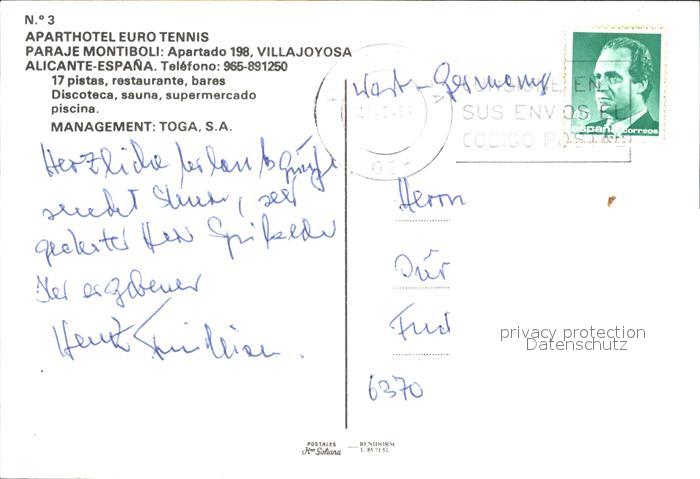 old postcard Alicante Aparthotel Euro Tennis Strandpartie postalisch gelaufen Erhaltung siehe scans