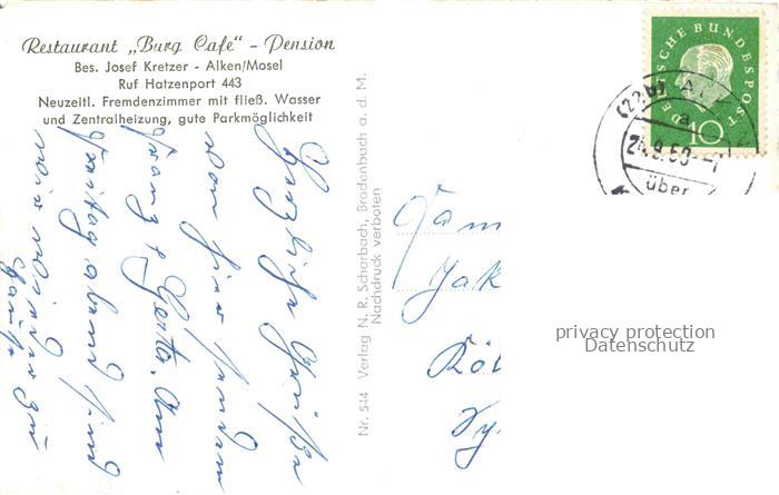 74038620 alte Postkarte Alken Mosel Burg Thurant Restaurant Burg Cafe Pension Panorama postalisch gelaufen Erhaltung siehe scans [WerneD78] KatCode: 11110007137201