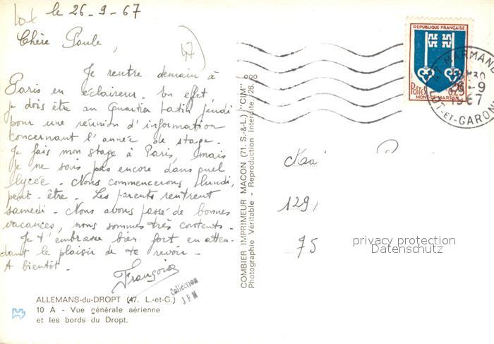 13153853 carte postale Allemans-du-Dropt Fliegeraufnahme Br?cke M?hle postalisch gelaufen Erhaltung siehe scans [KathaD81] KatCode: 11170047247005
