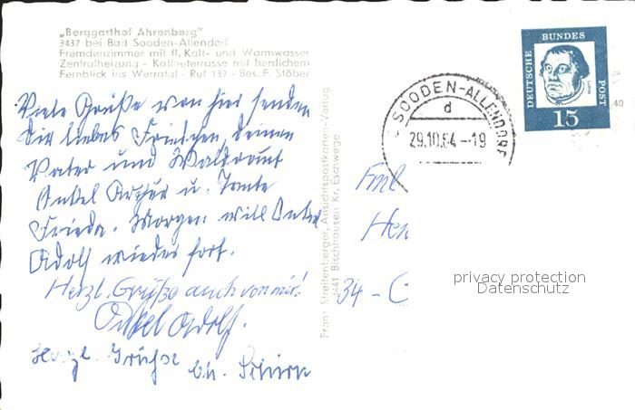 72010771 alte Postkarte Allendorf Bad Sooden Fernsicht vom Berggasthof Ahrenberg postalisch gelaufen Erhaltung siehe scans KatCode: 11110006436001