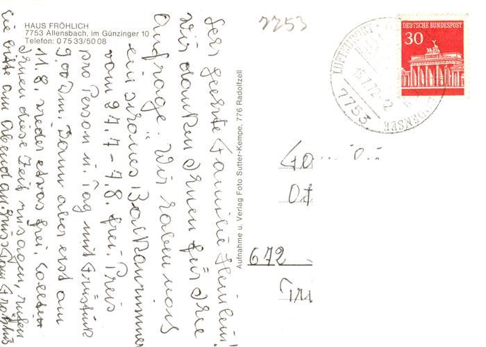 73937837 alte Postkarte Allensbach Bodensee Gaestehaus Haus Froehlich postalisch gelaufen Erhaltung siehe scans [FriedD77] KatCode: 11110008335002