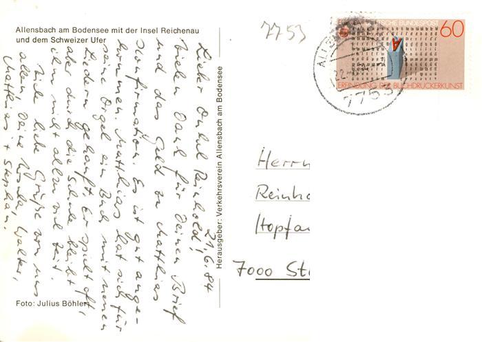 73941891 alte Postkarte Allensbach Bodensee mit der Insel Reichenau und dem Schweizer Ufer postalisch gelaufen Erhaltung siehe scans [WerneD78] KatCode: 11110008335002