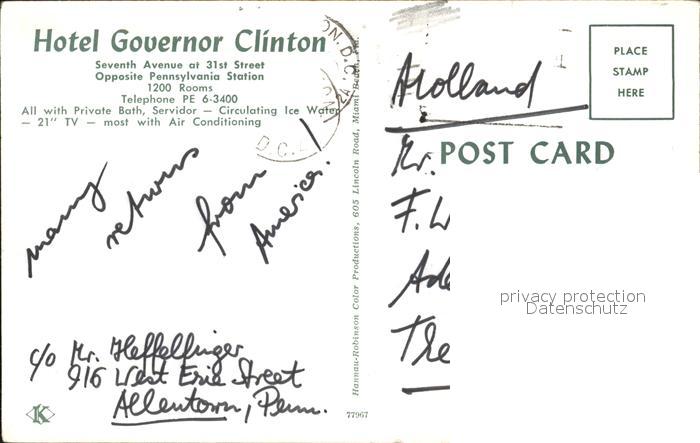 72462557 old postcard Allentown Pennsylvania Hotel Governor Clinton postalisch gelaufen Erhaltung siehe scans KatCode: 14140410000000