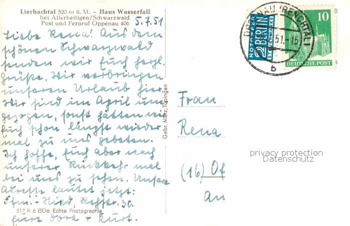72818534 alte Postkarte Allerheiligen Oppenau Lierbachtal Haus Wasserfall postalisch gelaufen Erhaltung siehe scans [NatalD47] KatCode: 11110008317098
