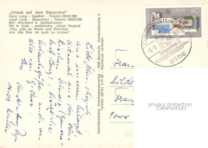 73671383 alte Postkarte Allersdorf Forchheim Dorfweiher Gasthof Wasserstein Urlaub auf dem Bauernhof Hansa-Linde Panorama postalisch gelaufen Erhaltung siehe scans [FriedD77] KatCode: 11110009474129
