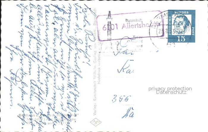 72592213 alte Postkarte Allertshofen Darmstadt Gasthaus Pension Schuetzenhof postalisch gelaufen Erhaltung siehe scans [AntonD74] KatCode: 11110006432013