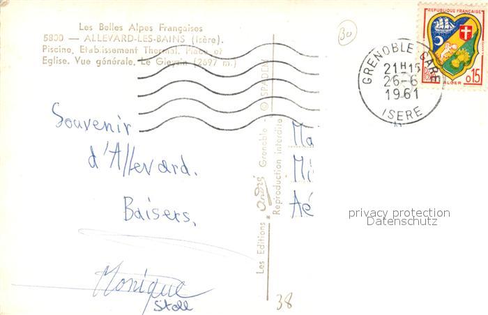13503908 carte postale Allevard les Bains Isere Piscine Etablissement Thermal Place Eglise Glacier du Gleyzin Alpes postalisch gelaufen Erhaltung siehe scans [FriedD77] KatCode: 11170038138006