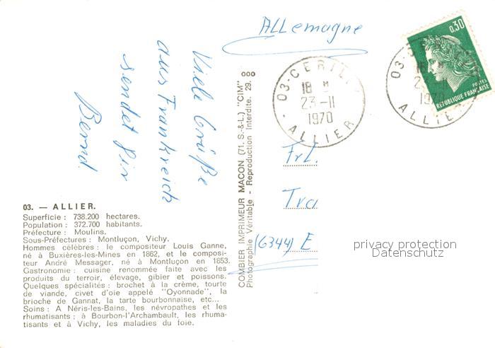 13591246 Allier Vues d ensemble Carte postalisch gelaufen Erhaltung siehe scans [FriedD77] carte postale Frie Katcode 11170065365005