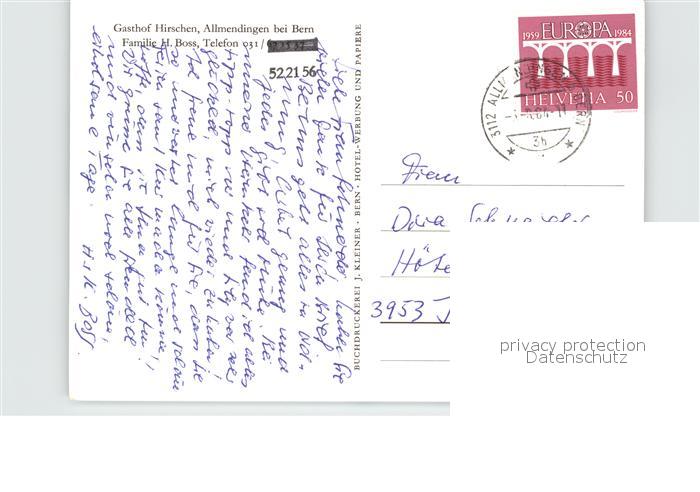 12574821 alte Postkarte Allmendingen Bern Gasthof Hirschen Gaststube Wildgehege postalisch gelaufen Erhaltung siehe scans [WerneD78] KatCode: 11470060180308