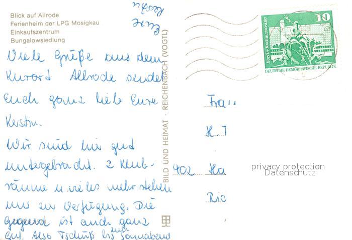 73028183 alte Postkarte Allrode Ferienheim LPG Mosigkau Einkaufszentrum Bungalowsiedlung postalisch gelaufen Erhaltung siehe scans [KathaD81] KatCode: 11110015085010