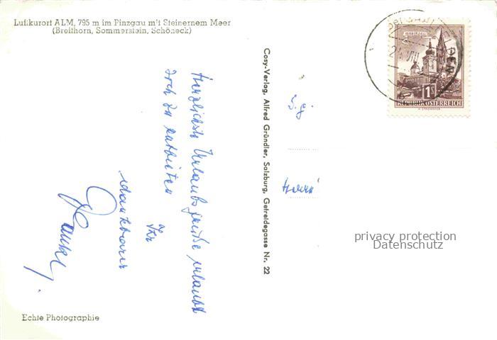 74025160 alte Postkarte Alm Saalfelden am Steinernen Meer Pinzgau AT Kirche Luftkurort Blick gegen Breithorn Sommerstein Schoeneck postalisch gelaufen Erhaltung siehe scans [FriedD77] KatCode: 11390322050619